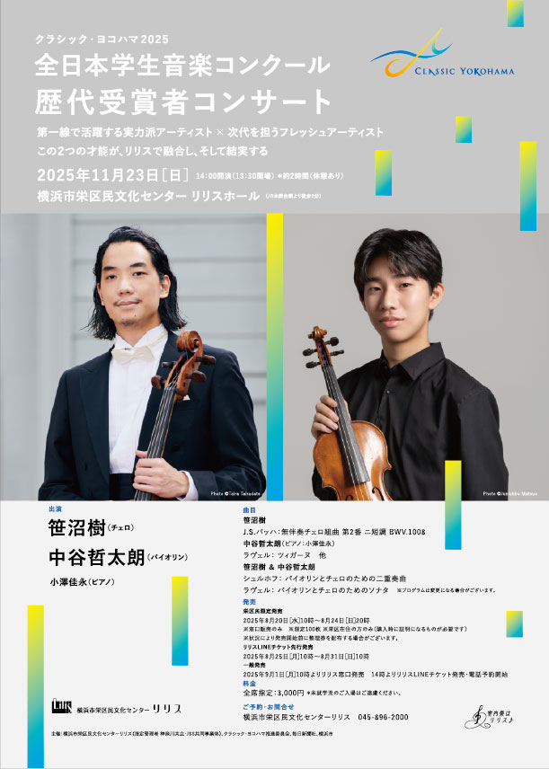 本公演は、クラシック・ヨコハマと全日本学生音楽コンクールを多くの方に知っていただくこと、また、全日本学生音楽コンクール入賞者のフレッシュな演奏をお届けすることを目的として開催いたします。