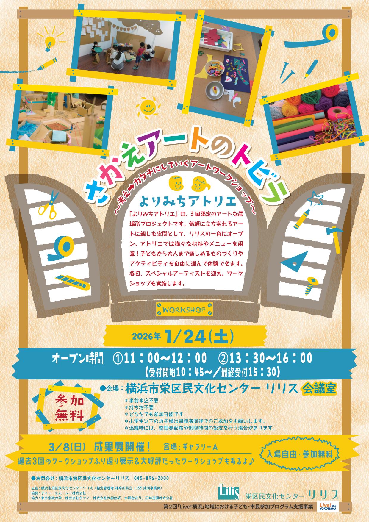 3 回限定のアートな居場所プロジェクトです。気軽に立ち寄れるアートに親しむ空間として、リリスの一角にオープン。アトリエでは様々な材料やメニューを用意!子どもから大人まで楽しめるものづくりやアクティビティを自由に選んで体験できます。各日、スペシャルアーティストを迎え、ワークショップも実施します。
